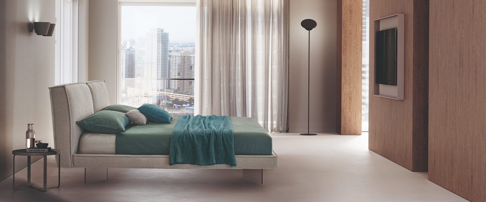 Il letto Oasi si distingue per le sue linee squadrate, definite ma mai rigide, che conferiscono un aspetto solido e contemporaneo, mentre i volumi generosi