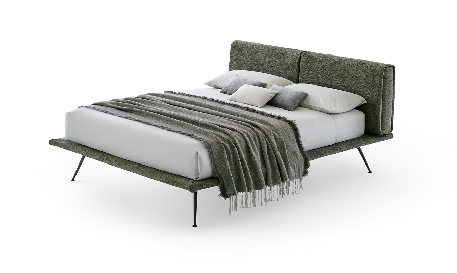 Il letto Sinfonia unisce eleganza e design minimale, arricchiti da un raffinato richiamo allo stile retrò. La sua struttura è realizzata in multistrato di legno e metallo, materiali che garantiscono solidità e leggerezza al tempo stesso. Protagonista assoluta è la testata, composta da due cuscini indipendenti dalle forme morbide ed eleganti, pensati per offrire un comfort avvolgente e una piacevole sensazione di accoglienza. Questi elementi sembrano sospesi, in perfetto equilibrio sulla sottile struttura metallica di supporto, quasi a sfidare la gravità. La silhouette essenziale ma ricercata dona al letto una presenza scenica discreta ma distintiva, capace di inserirsi armoniosamente in ambienti moderni.
