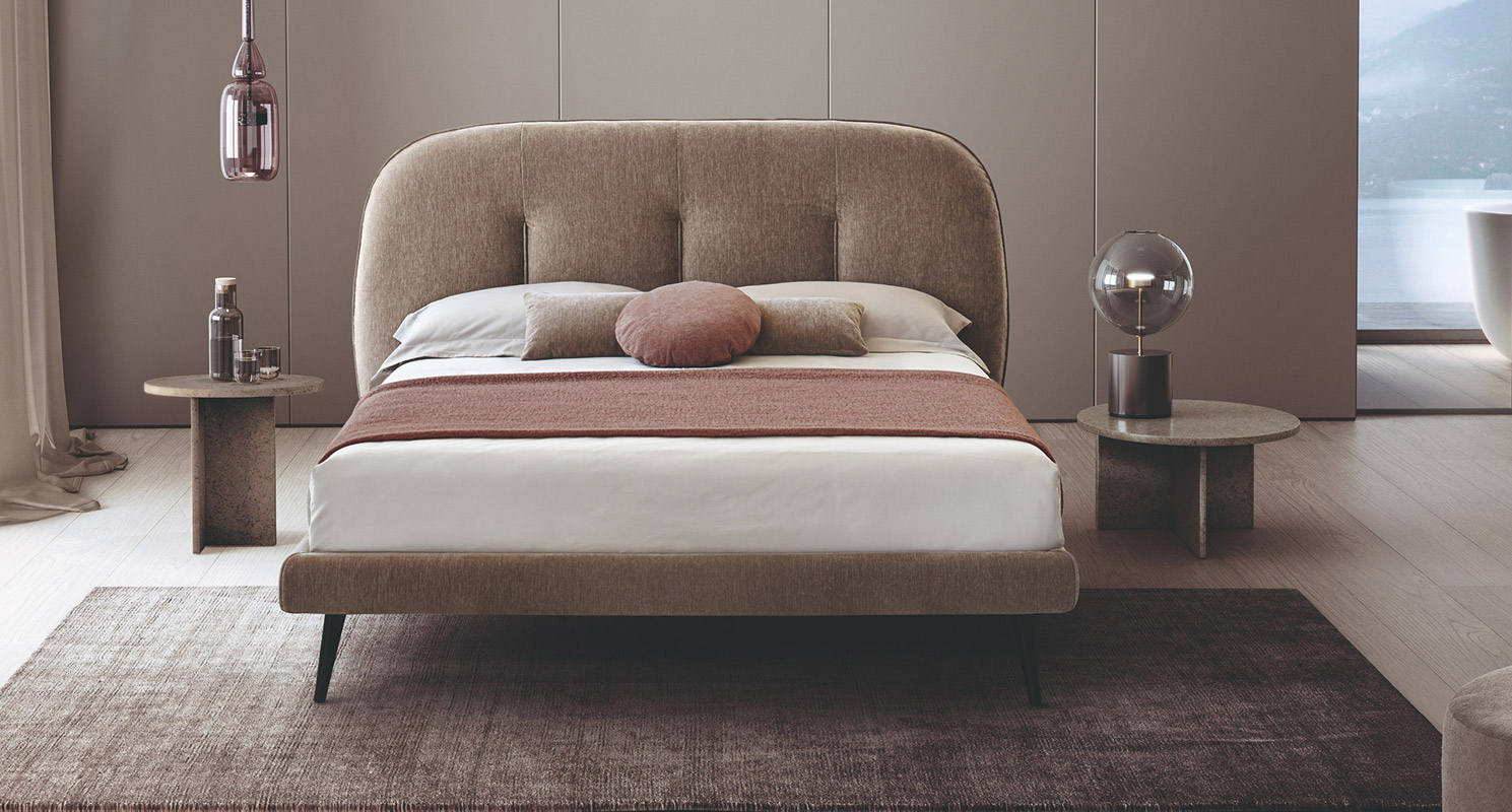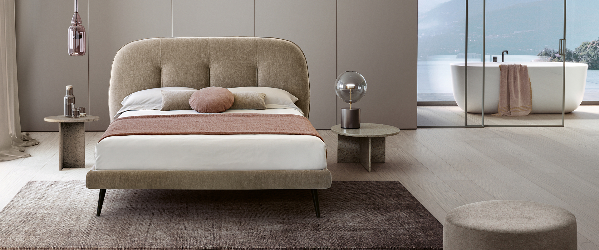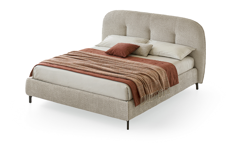 Tratto presenta una testata curva e accogliente, incorniciata da un bordino sottile che ne sottolinea la forma. I bordini verticali suddividono la testata in quattro fasce ben definite, donando profondità e tridimensionalità al disegno. Il risultato è un letto dallo stile moderno e morbido, adatto ad ambienti attuali che ricercano eleganza senza eccessi. Tratto è una scelta equilibrata tra sobrietà formale e attenzione al dettaglio.