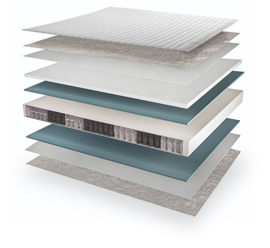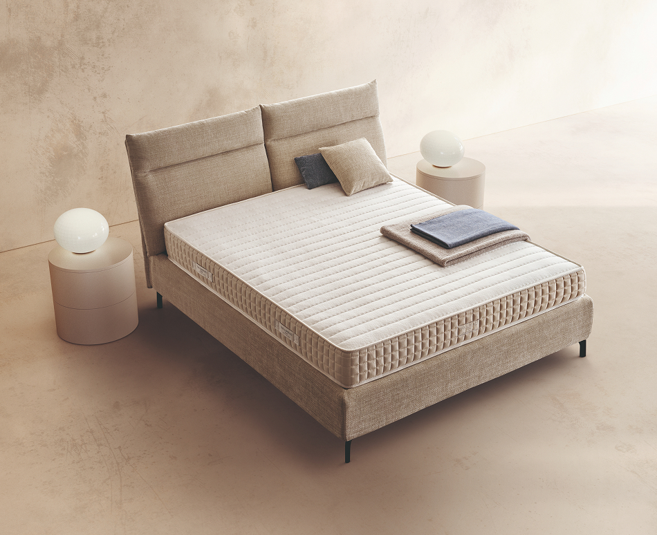 Rivestito in tessuto a maglia Basic Stretch, elastico e avvolgente, segue con naturalezza i movimenti del corpo, valorizzando le sue caratteristiche di adattabilità e traspirabilità. L’imbottitura in Waterfoam indeformabile assicura un sostegno costante nel tempo, mentre lo strato superiore della lastra di 2 cm in Memory foam visco-elastico si modella alla perfezione sulla fisionomia, offrendo un'accoglienza morbida e personalizzata. Al centro, un box in Waterfoam incapsula il sistema a molle insacchettate a escursione indipendente, suddivise in 7 zone di portanza differenziata. Grazie alle 700 molle nel modello matrimoniale e 350 nel modello singolo, ogni zona del corpo riceve il giusto livello di sostegno, favorendo un allineamento corretto della colonna vertebrale.